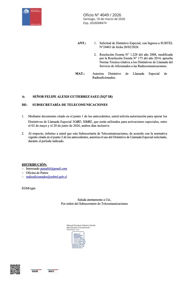 NOTA de Felipe: Subtel, autoridad chilena de licencias, ha confirmado los indicativos especiales para esta actividad: 3G0Z y XR0Z.